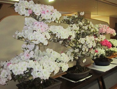 一本の樹に、白、薄いピンク、濃いピンクの花が咲きます。